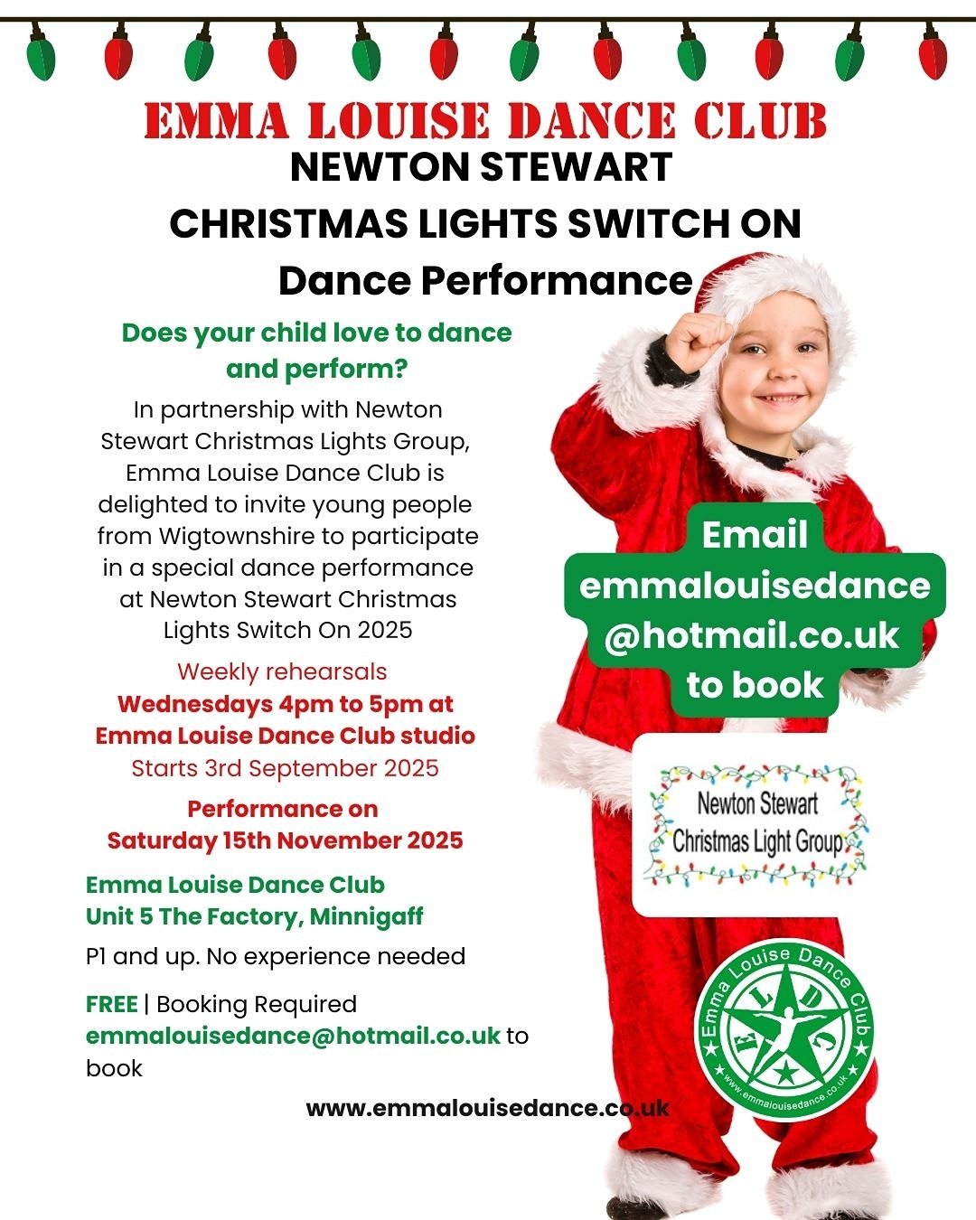 In partnership with Newton Stewart Christmas Lights Group, Emma Louise Dance Club is delighted to invite young people from Wigtownshire to participate in a special dance performance at Newton Stewart Christmas Lights Switch On 2025